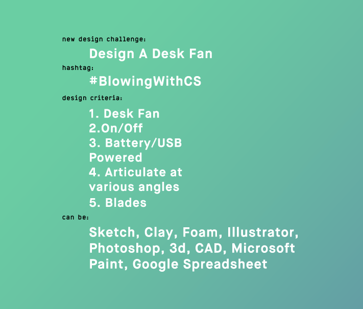 Join the design party. We're redesigning the desk fan and calling it #blowingwithcs. Criteria's are listed below.